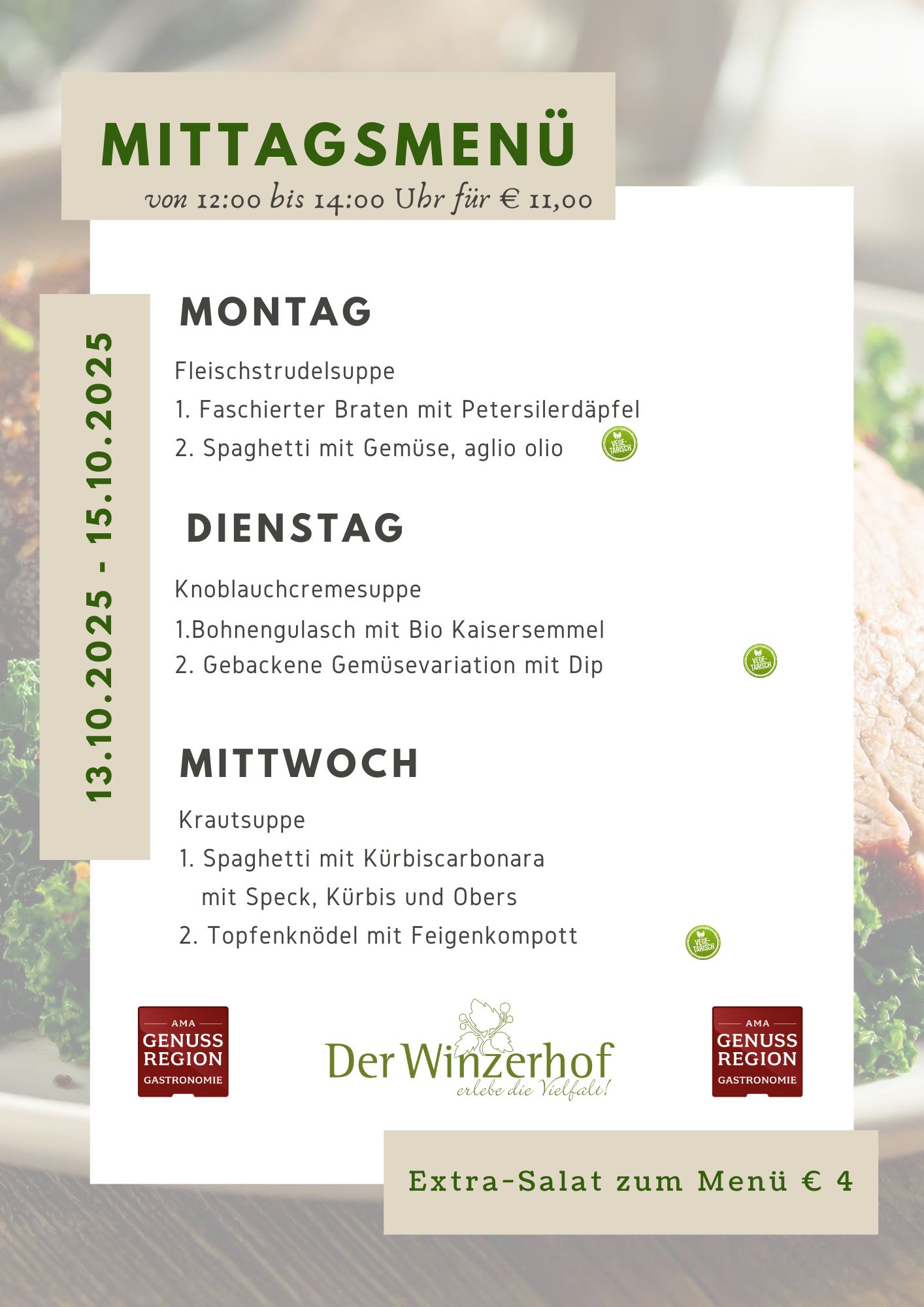 Von Montag bis Mittwoch von 12:00 bis 14:00 Uhr kommst du in den Genuss unseres Mittagsmenüs. Weiters servieren wir ein erlesenes vegan/vegetarisches Mittagsteller, mit viel Liebe und in überwiegender Bioqualität gekocht. Ein Tagesteller für Fleischliebhaber ergänzt dieses Angebot. Knackige Salatvariationen aus unserer Salatbar bieten eine leichte und frische Alternative.